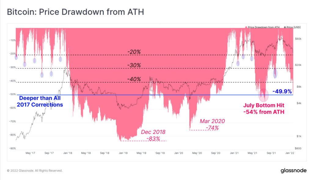 На момент написания, откат котировок биткоина от ATH практически достиг 50%. После медвежьего рынка 2018-2020 годов текущее снижение стало вторым по глубине после июля 2021 года, когда этот показатель составил 54%.