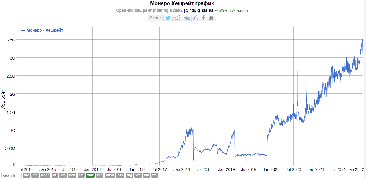 Хешрейт Monero вырос до исторического максимума — 3,503 гигахеш в секунду (GH/s).