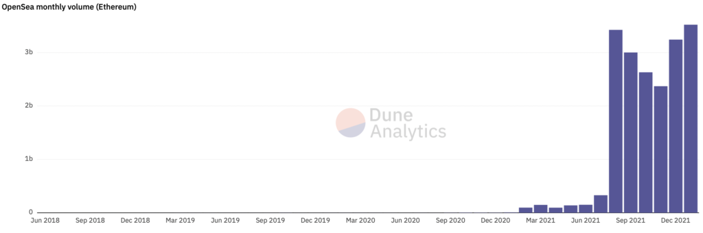 С 1 января объем торгов маркетплейса невзаимозаменяемых токенов (NFT) OpenSea достиг $3,52 млрд, согласно Dune Analytics. Показатель обновил установленный в августе 2021 года максимум.