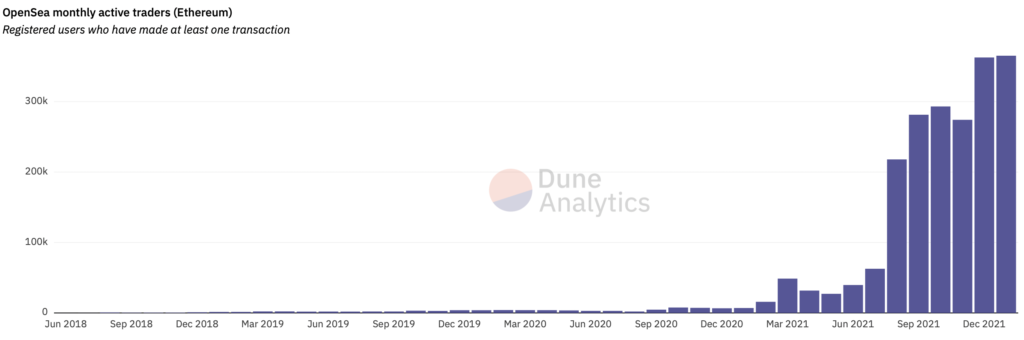 Согласно Dune Analytics, OpenSea также достиг рекордного количества активных пользователей. За неполный январь показатель превысил 365 тысяч, а в декабре составил 362 тысячи.