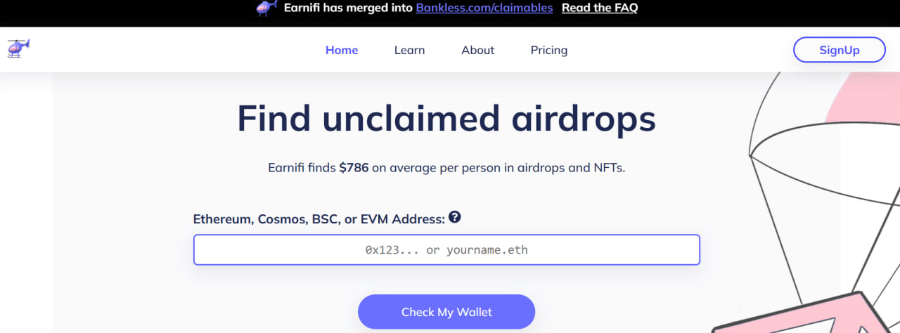 Похожий сервис, который анализирует адреса в блокчейне и ищет пропущенные аирдропы. Он особенно полезен для пользователей, активно работавших с DeFi-протоколами.