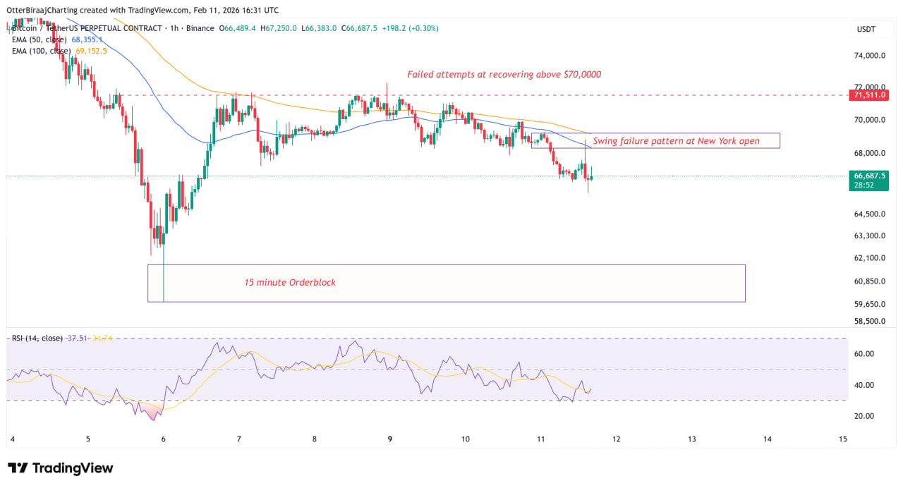 Биткоин оказался в зоне неопределенности. Отказ закрепиться выше $70 000 усилил давление, а разрыв ликвидности ниже текущих уровней делает тест $60 000 вполне вероятным.