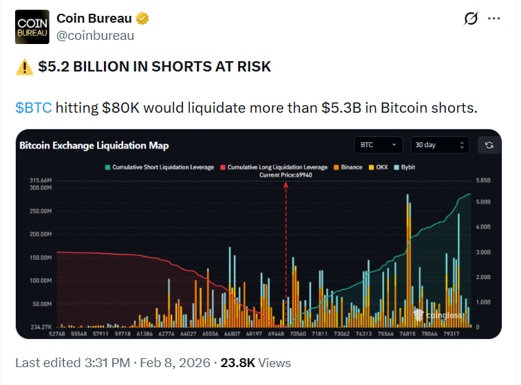По данным рынка деривативов, при росте цены биткоина к $80 тыс. под угрозой ликвидации могут оказаться короткие позиции на сумму свыше $5 млрд. Эти оценки привлекли внимание трейдеров после публикации аналитики Coin Bureau и были подтверждены агрегированными данными по позициям на крупнейших биржах.