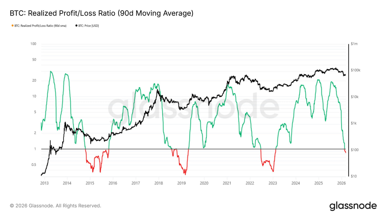 Дополнительным признаком слабости рынка остаётся поведение участников. Данные аналитических платформ показывают, что инвесторы всё чаще продают биткоин с убытком.