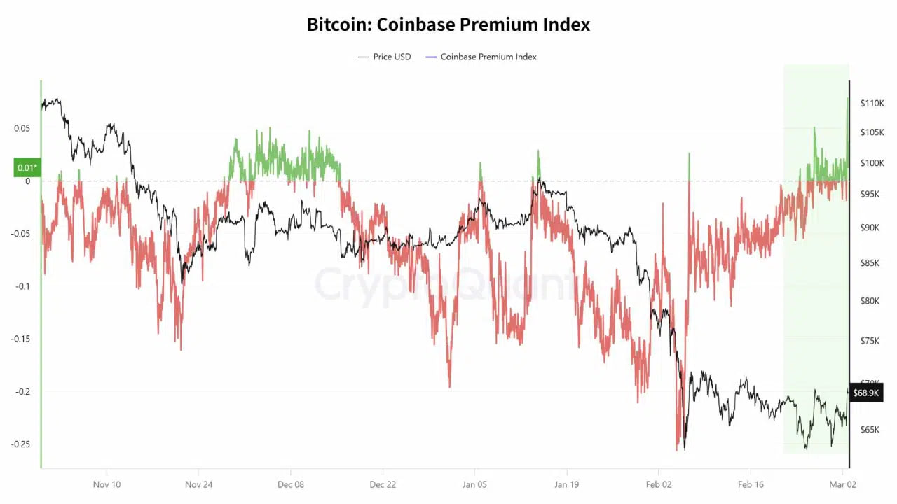 Показатель, отражающий разницу в цене биткоина между крупнейшей американской площадкой и глобальными рынками, вновь оказался выше нуля. В начале марта значение индекса достигло примерно 0,01. Это первый положительный сигнал с середины января. Цифра скромная. Но сам разворот важнее уровня.