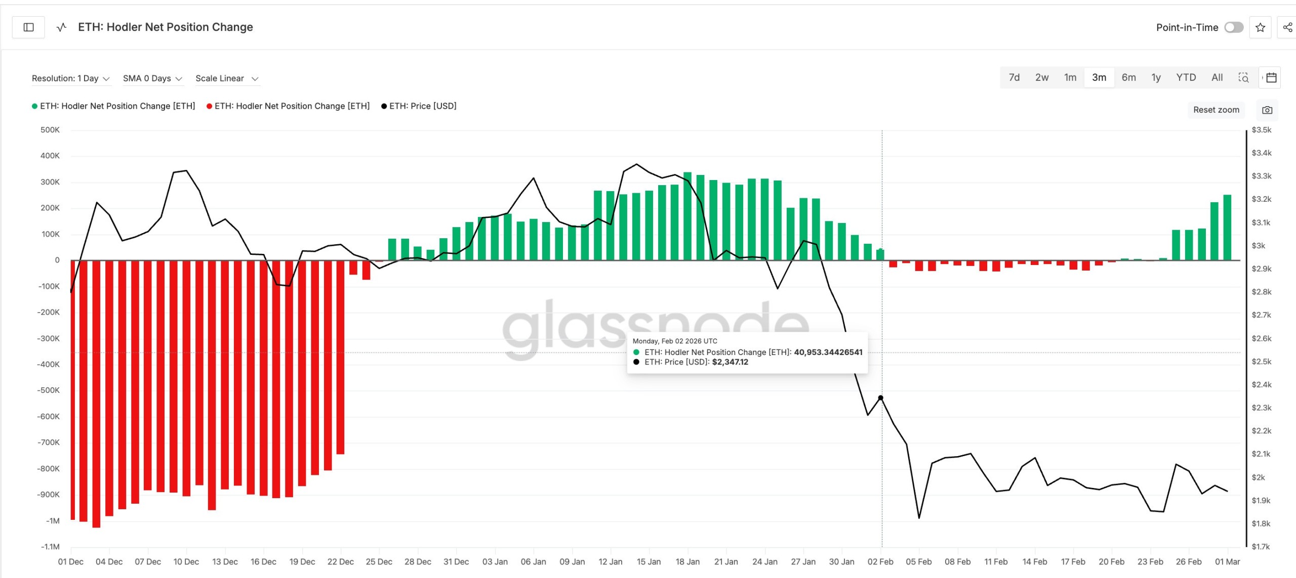 21 февраля показатель изменения чистой позиции холдеров составлял всего +6 829 ETH. Уже к 1 марта он вырос до +252 142 ETH. Это скачок примерно на 3 500%, который на первый взгляд выглядит как сильный сигнал уверенности со стороны опытных участников рынка.