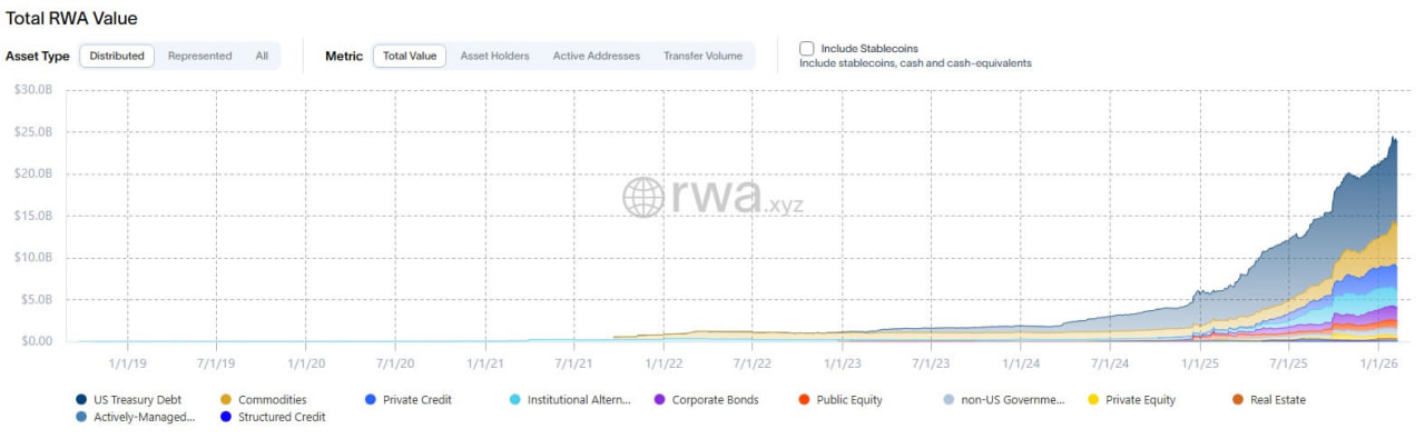 По данным RWA.xyz, совокупная стоимость токенизированных реальных активов на блокчейне за последние 12 месяцев выросла примерно на 300%.