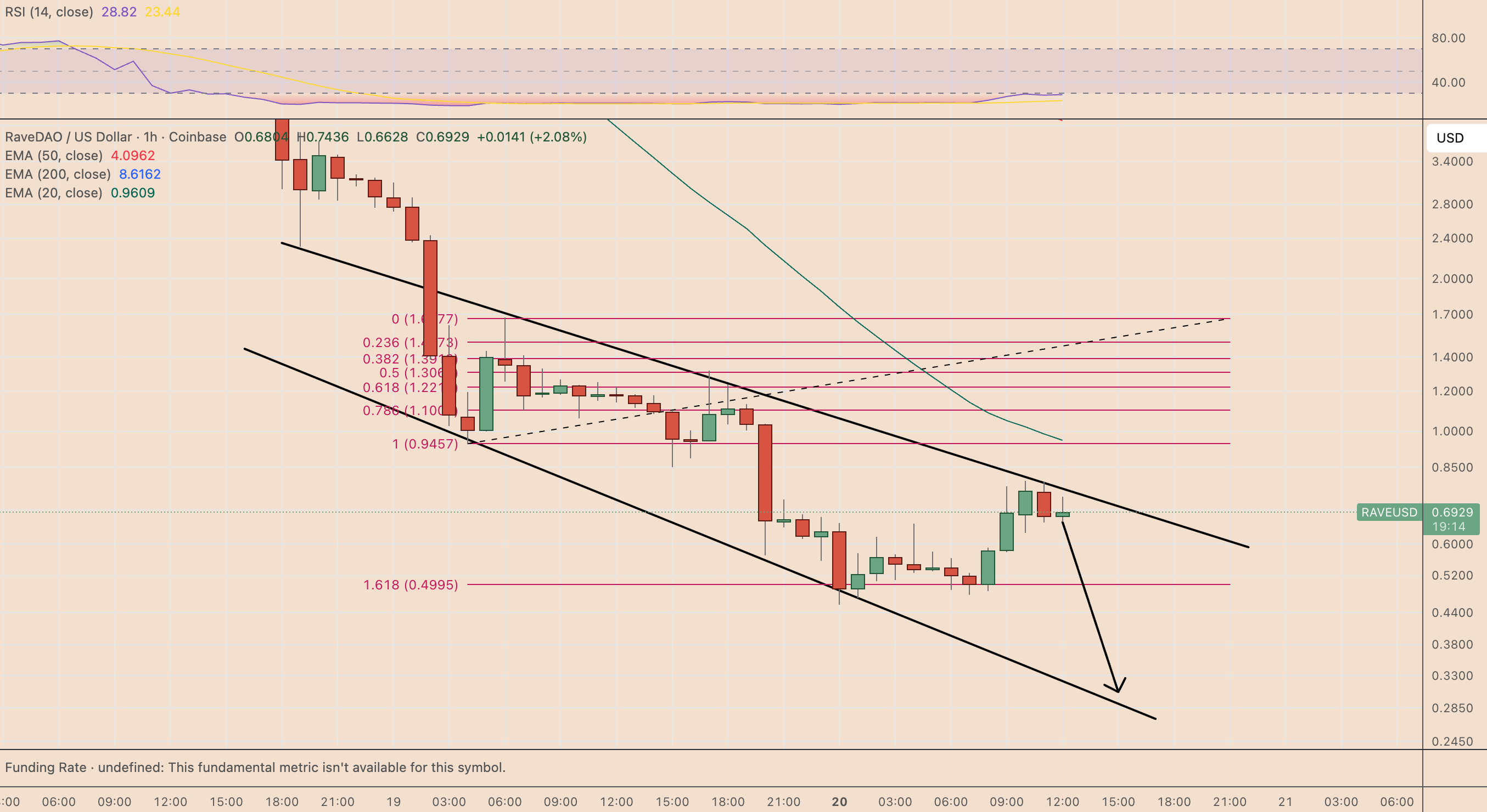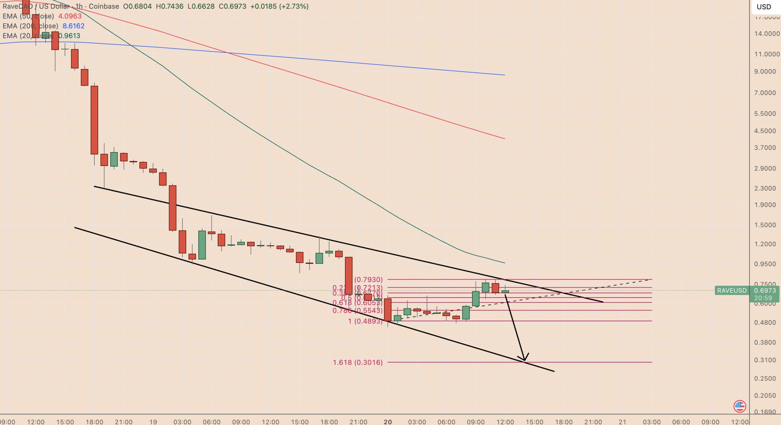 Токен RAVE от RaveDAO обвалился более чем на 98% за выходные, а часовой график намекает на новое сильное падение уже в ближайшие дни.