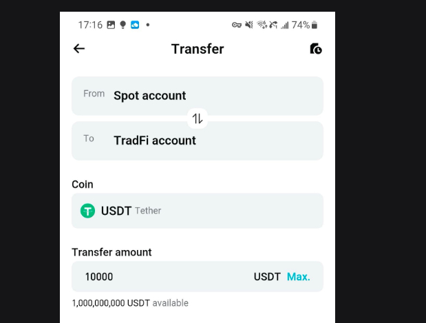 3. Укажите источник средств в USDT и в качестве получателя выберите TradFi Account.